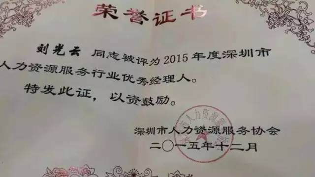 —公司总经理刘光云被评为“2015深圳市人力资源服务行业优秀经理人”