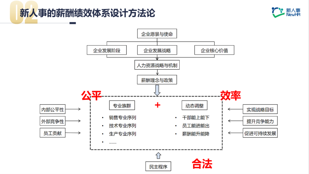 马老师认为:薪酬绩效设计的方法论必须围绕三大重点——公平、效率、合法。