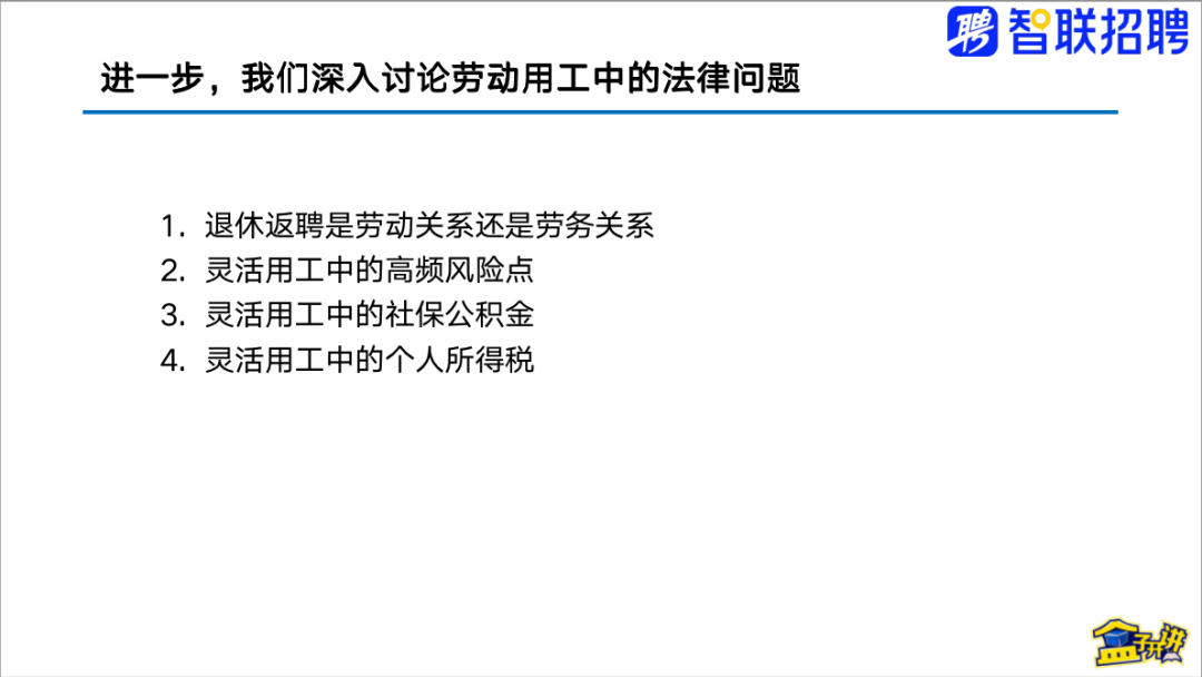 为使企业和人力资源从业者能够深入了解灵活用工模式,9月15日,薪酬绩效与劳动法专家马勇老师受智联招聘邀请,在长春以“灵活用工模式的崛起与顶层设计——以合规方式规避风险、降成本”为主题,围绕灵活用工的快速崛起、劳动用工的法律问题及灵活用工的顶层设计与风险点展开了精彩的分享。