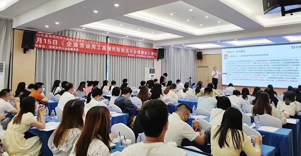 2022年7月15日,深圳市中小企业服务局的2022年度深圳市中小企业产业紧缺人才培训项目第45次讲座在深圳金谷创业园举行,该次讲座邀请到了新人事的马勇老师,分享了关于企业劳动用工高频风险防范与合规建议的主题培训。