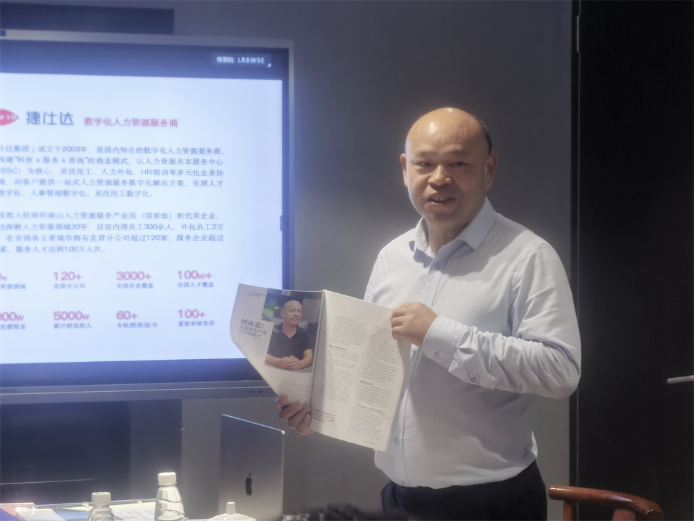 座谈会上,刘光云董事长首先对从淄博市远道而来的各位领导表示热烈的欢迎,并对捷仕达集团的发展历程、一站式蓝领招聘解决方案等核心业务、战略合作模式进行了详细的介绍。